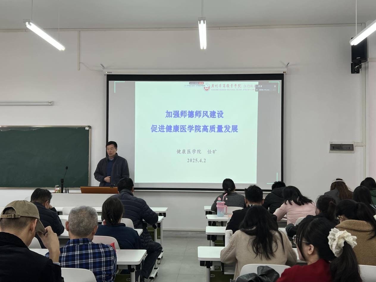 2025年4月2日,健康医学院成功举办“加强师德师风建设,促进健康医学院高质量发展”专题培训讲座。活动由健康医学院洪文艳院长主持,教学副院长任旷教授主讲,全院教师共同参与。本次培训旨在强化教师职业道德素养,为学院高质量发展注入新动能。