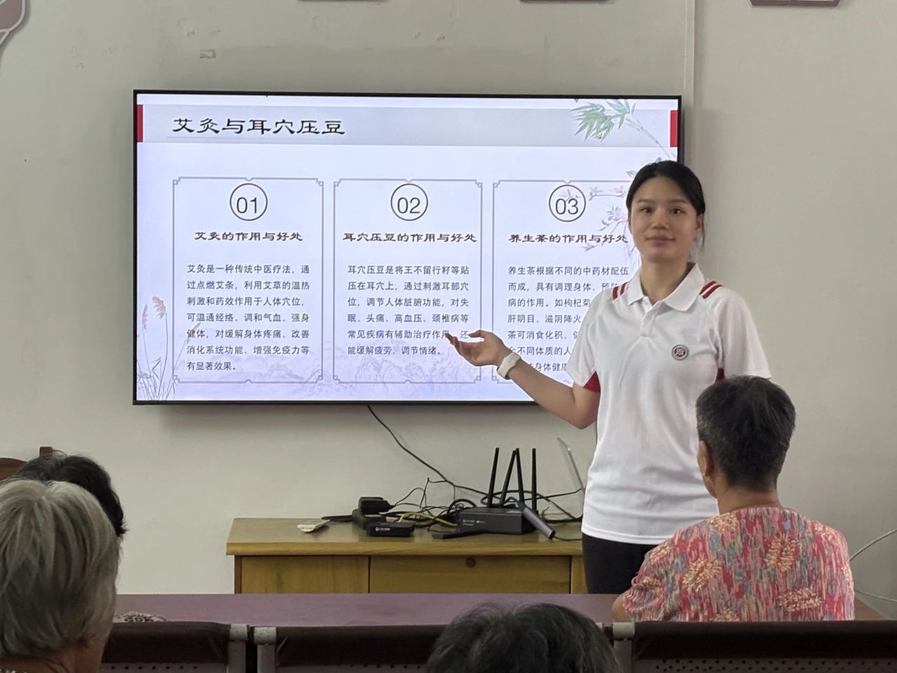 队员们详细介绍了艾灸的原理——点燃艾条,借助艾草的温热之力与药性作用于特定穴位,能有效温通经络、调和气血、强身健体,对缓解疼痛、改善消化、提升免疫力效果显著。随后,又介绍了耳穴的妙用,小小“王不留行籽贴”压耳穴,却能调节脏腑功能,成为辅助治疗失眠、头痛等多种常见问题的好帮手。