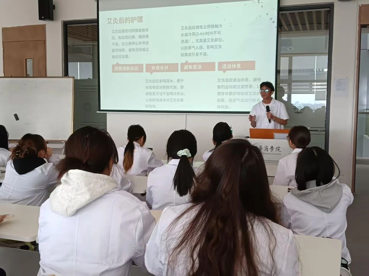 在实操环节,队员们自由组队,两两互练。现场氛围专注而热烈,王子允队长穿梭在各组之间,从艾条的握持角度、与皮肤的安全距离,到施灸时长的把控,逐一进行细致指导。队员们积极交流心得,互相分享感受。