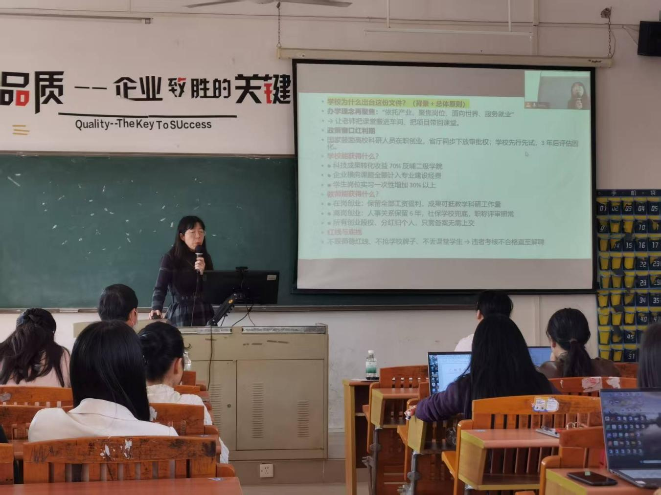 紧接着,院长洪文艳重点解读了《广州华商职业学院教职工在岗离岗创业管理办法(试行)》。她结合文件条款与学院实际,围绕政策适用范围、申请条件、流程及相关待遇等内容展开阐述,为有创业意愿的教职工提供明确指引,鼓励大家在做好本职工作的同时,积极探索教学、科研与社会服务融合的新路径。