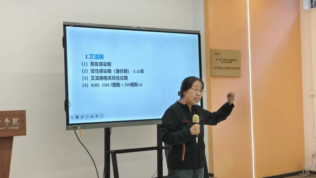 马爱新教授凭借其三十多年在病原生物学领域的深厚造诣和丰富的教学经验,为同学们系统梳理了艾滋病的发病原理、传播途径及防治策略。她用严谨的科学数据和真实的案例,深入浅出地讲解了艾滋病的传播机制,重点传授了如何识别和远离高危行为、如何正确进行自我保护以及发生暴露风险后如何寻求专业帮助等。