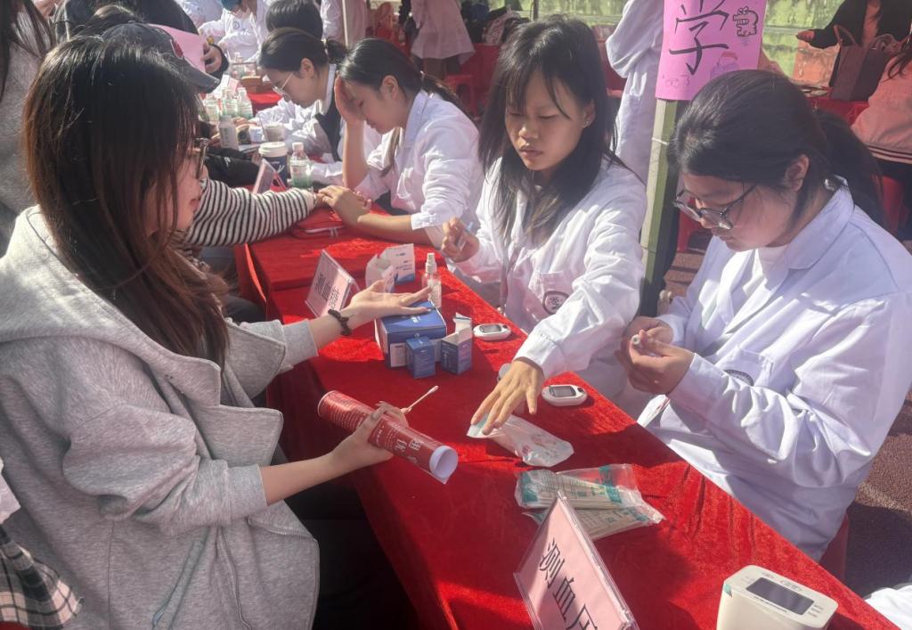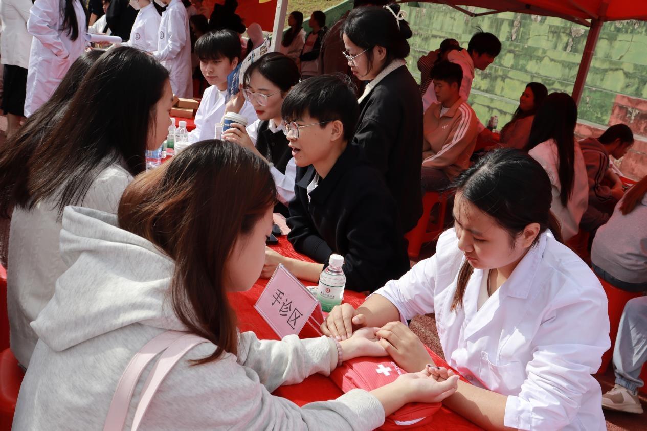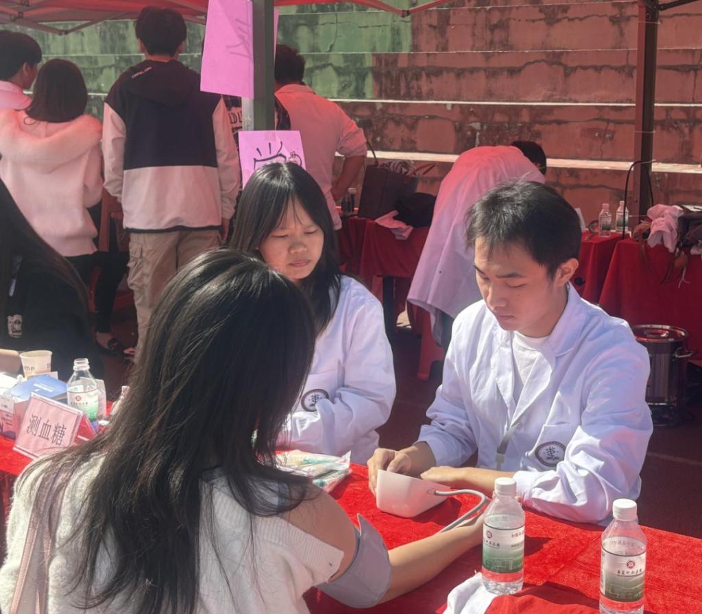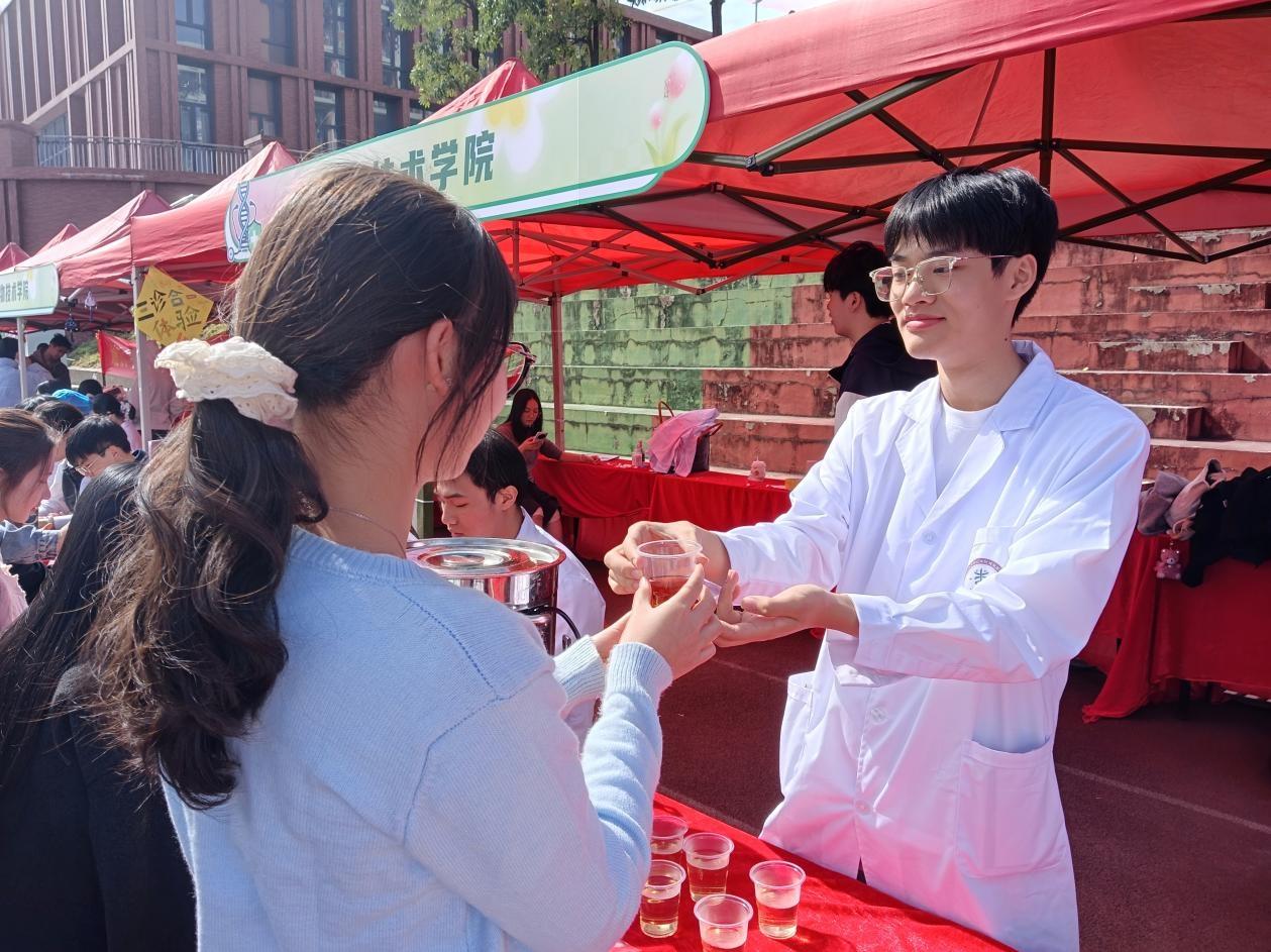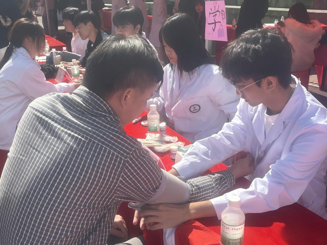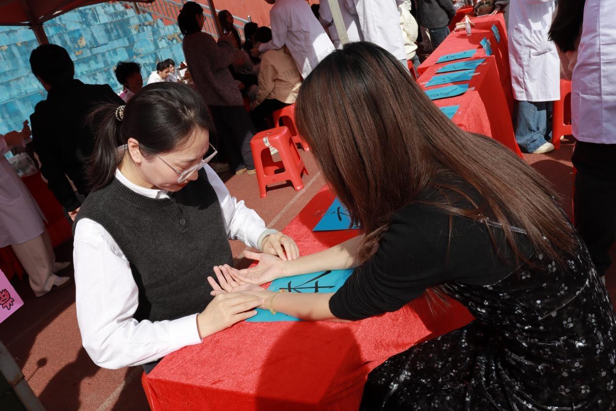 活动现场,服务队成员分工协作、专业高效:健康监测组为师生提供血压、血糖等基础指标检测,并结合数据给予个性化健康指导;花茶组的成员们则贴心奉上罗汉果陈皮茶与金银花菊花茶在氤氲热气中传递着温暖关怀;软康班同学现场开展针灸体验、脉诊手诊等传统中医特色服务,通过经络调理与体质辨识,普及“治未病”理念,赢得广泛好评。