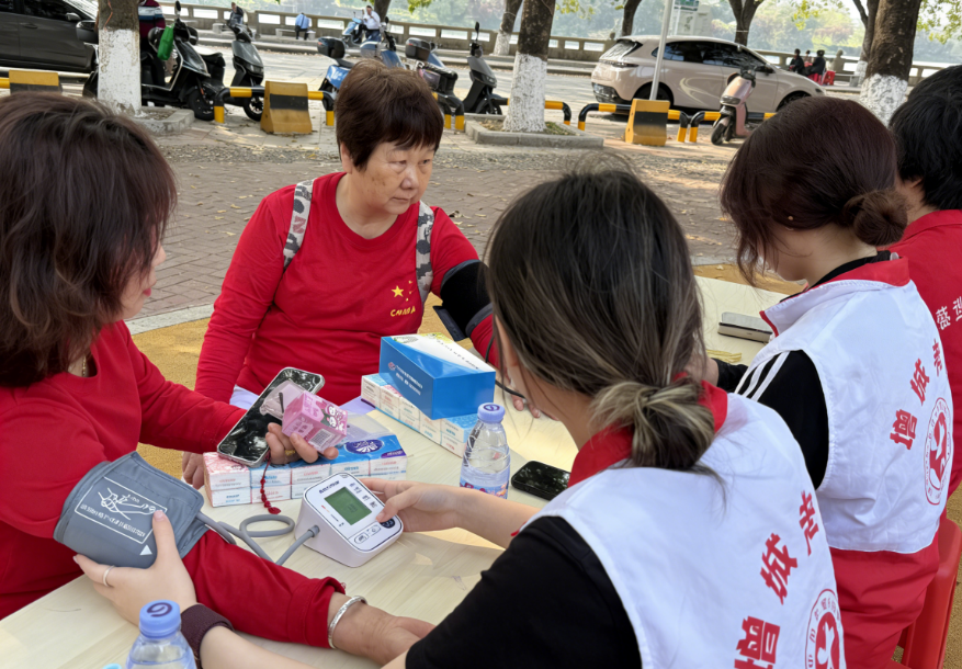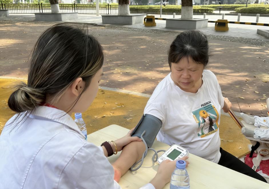 活动现场,我院志愿者迅速分工、默契配合,有序为社区老人及困难特殊群众开展免费血压测量、慢性病健康指导。大家耐心为老人绑袖带、测血压、记录数据,针对高血压、糖尿病等常见问题,细致讲解日常饮食、科学用药、合理运动与心理调适等知识,把专业健康服务送到居民身边。