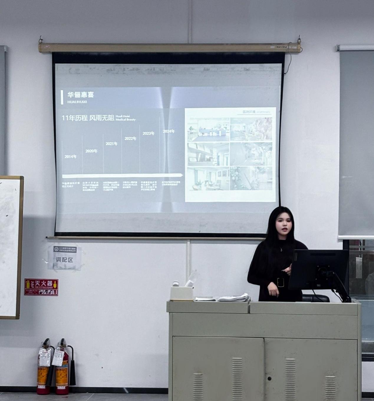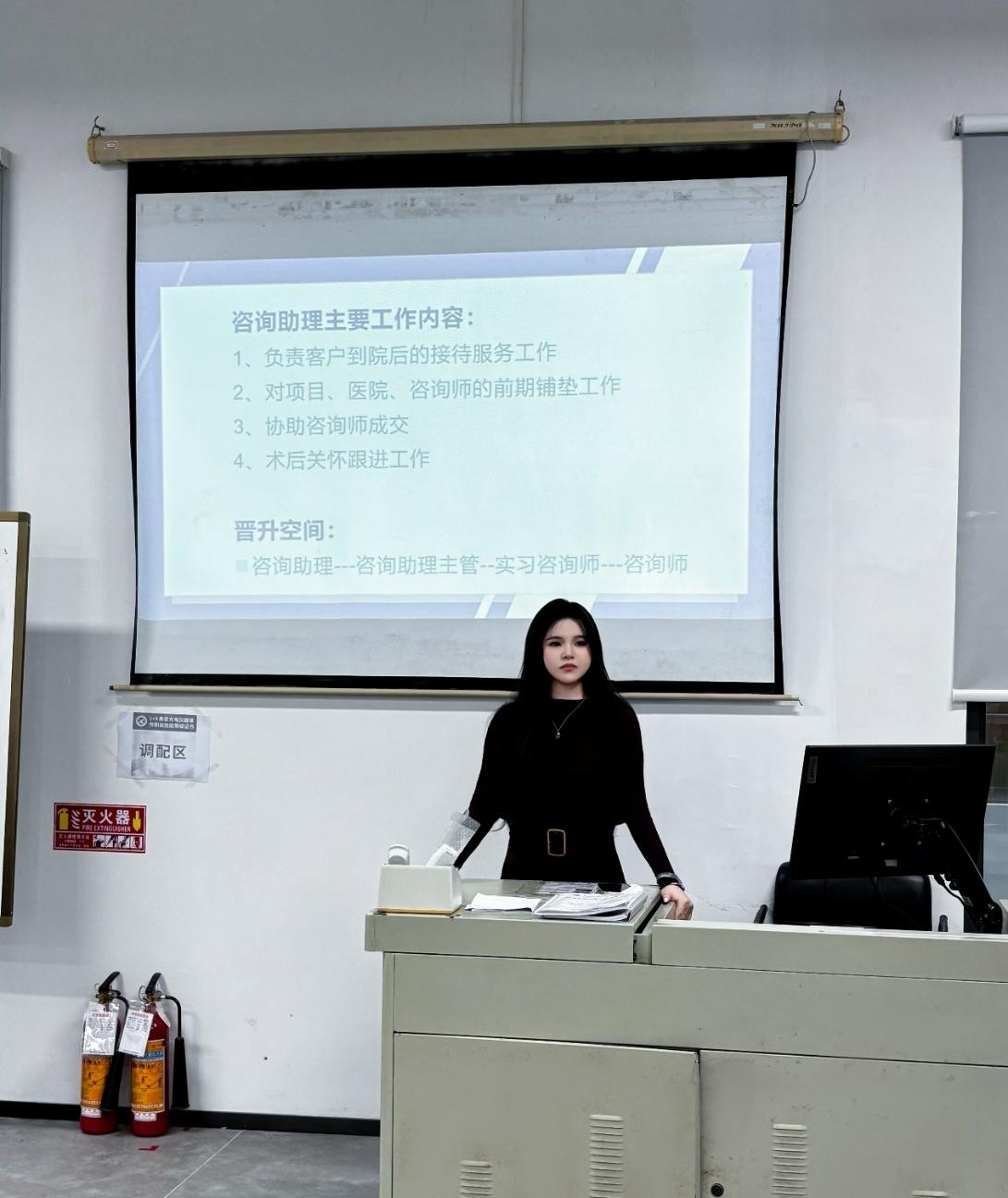 本次宣讲会特别邀请到该校2025届优秀毕业生、现任华俪惠喜市场部咨询师的陈美雪重返母校进行分享。她结合自身从校园到职场的转变历程,生动讲述了作为一名市场咨询师(美导)的日常工作,包括项目培训、活动传达、客户邀约等具体职责,并清晰梳理出“咨询顾问、区域总监、市场副总经理”的职业晋升路径。陈美雪的真诚分享,让在座同学对未来的岗位职责与成长空间有了更加具象的认知。