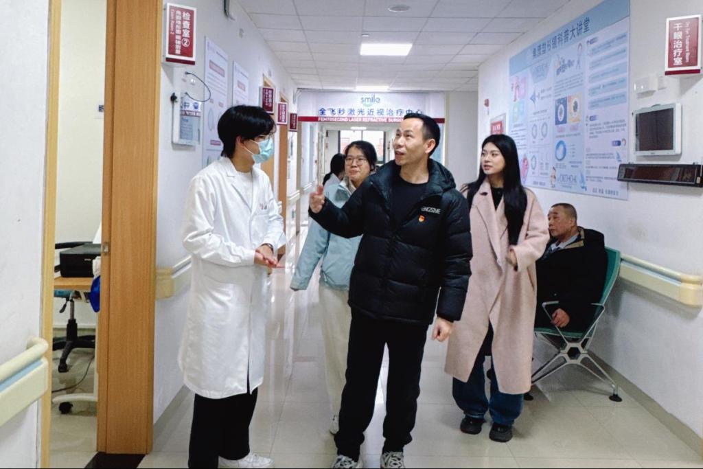 南方医科大学南方医院增城院区眼科门诊主任马明对戴乐毅主任一行表示热烈欢迎。随后,学生代表蔡程带领考察团先后参观了门诊验光配镜中心、特检室、全飞秒激光近视治疗中心等核心诊疗区域,详细介绍了科室的医疗设备配置标准、日常诊疗工作流程、日均患者接诊量,以及在眼视光疾病诊疗、青少年近视防控、医学验光配镜等领域的特色优势与核心技术实力。