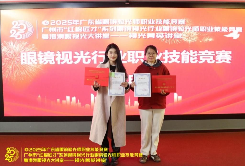 2025年12月26日,由广东省眼镜行业协会、广州开放大学与广州市新概念眼镜视光职业培训学校联合主办的2025年广东省及广州市眼镜视光行业职业技能竞赛圆满落幕。我院眼视光技术专业学生谢华普、丁炜轩、罗晓玲、周远霞积极参与、表现出色,在多项评比中斩获荣誉,展现了扎实的专业技能与良好的职业素养。
