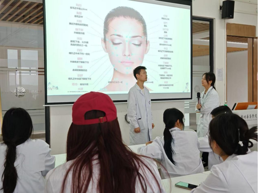 陈锦莹部长采用理论和实操二者结合的方式,让队员们快速掌握面部推拿的技能。在识别穴位环节,她随机挑选队员上台,检验大家对鱼腰、迎香、人中、承浆等穴位的认识程度,帮助大家精准定位穴位。