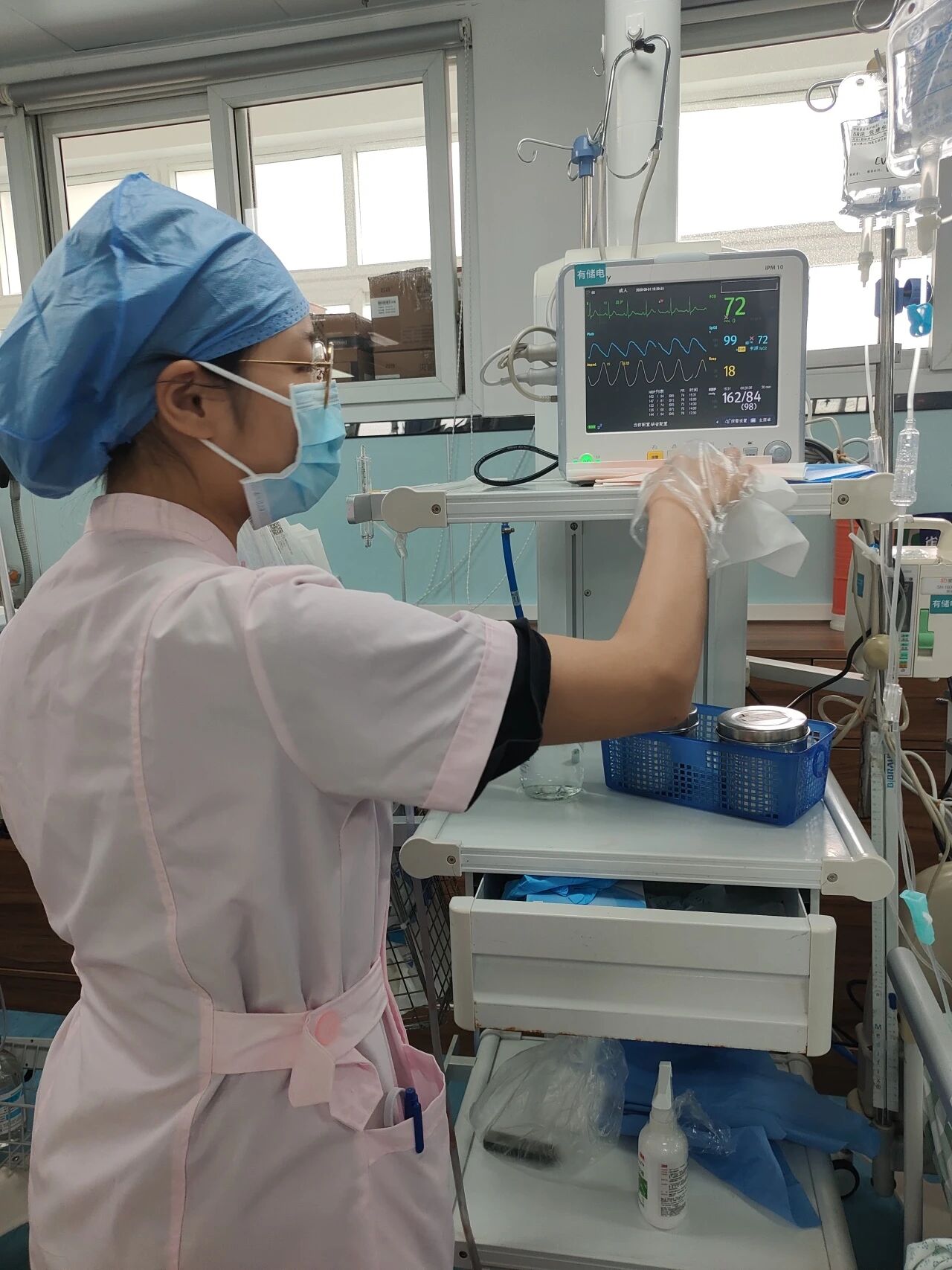 下面这张是我在ICU时的照片,当时我在给病人进行测血糖和交班时对心电监护进行消毒,在ICU面临的是患者长期卧床,需要的是两个及以上的护士配合其翻身,定时定量给予病人鼻饲喂养,时时刻刻监测患者血糖和生命体征,我在ICU学会了吸痰这是一项极其重要的护理,清理其呼吸道是维护生命体征的重要一项。