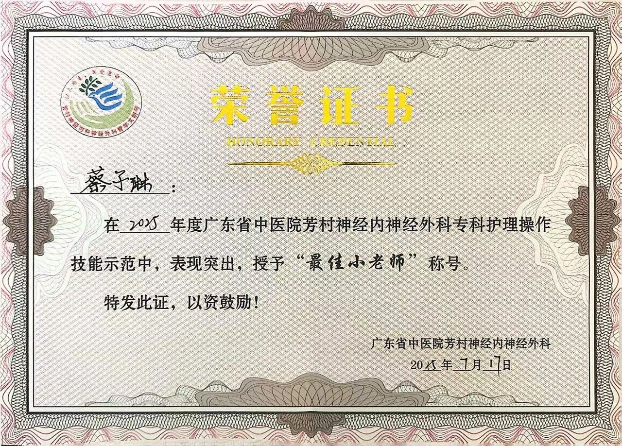 在广东省中医院实习期间,我轮转于中医传统疗法科、急诊、ICU等多个科室,深耕中医特色护理与急危重症救治。在科室专科护理操作技能展示中荣获“最佳示范老师”称号,以规范操作获带教老师高度认可。日常工作中,我秉持“以患者为中心”理念,耐心倾听患者诉求,细致开展健康宣教与情志护理,多次收到患者及家属手写感谢信,用专业与温度赢得信任,充分展现新时代护理实习生的责任与担当。