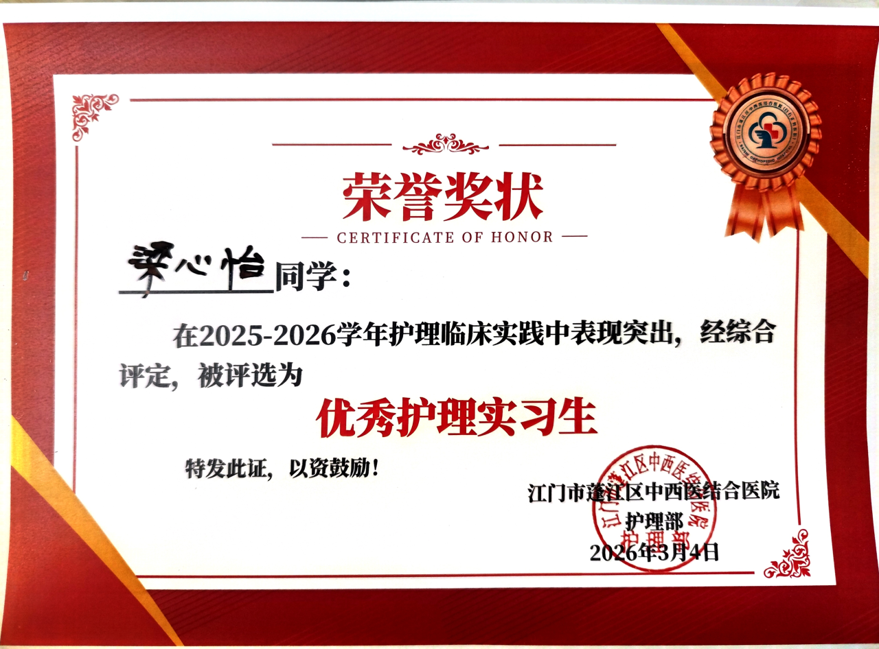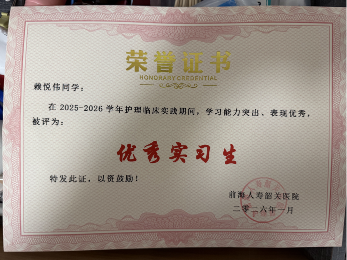 实习期间,我始终秉持医者初心,尊敬师长,团结同学,以爱心、耐心、责任心对待每一位患者。工作中认真负责、严谨细致,主动关心患者需求,积极做好护理服务与健康指导,用温暖与专业赢得带教老师及患者的一致认可。在临床实践中不断锤炼品格、提升素养,坚持理论联系实际,努力成长为有温度、有担当的护理学子,以实际行动践行护理使命。