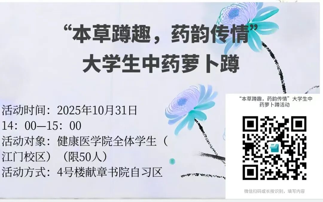 还在为记不住中药名头疼?想在轻松游戏中get中医药小知识?10月31日,院青协将开展“本草蹲趣,药韵传情”中药萝卜蹲活动,以经典萝卜蹲为载体融入黄芪、当归等常见中药元素,让你在紧张刺激的集体游戏中沉浸式感受中医药魅力,不知不觉记住中药名称与性味归经,同时提升反应力和团队协作感,告别枯燥静态科普,打破中药学习“死记硬背”的壁垒。