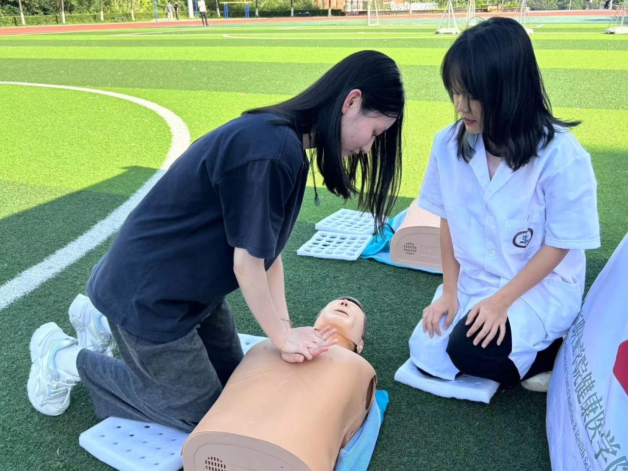 活动现场准备了模拟人体模型,供同学们体验心肺复苏。医心健康服务队队员详细讲解了按压定位、深度和频率等要点。指导前来体验的同学们通过亲身实践深入了解心肺复苏术的重要性,掌握这一关键的救命技术。
